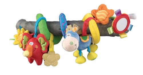 ?Sof spiral toy which easily attaches to most prams, pushchairs and cots.?Textured teethers to soothe sore gums with additional features such as rattle and squeaker sounds to help assist motor skills.Colour, texture and sound for unique sensory experiences. No strings, no ties. Simply wrap this Twirly Whirly around any stroller bar or cot rail for loads of exploring and fun. Read more Playgro Twirly Whirly